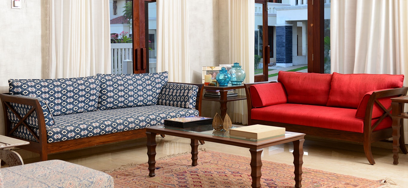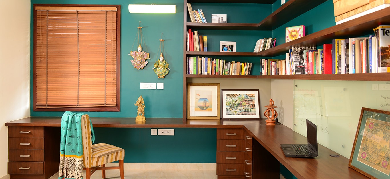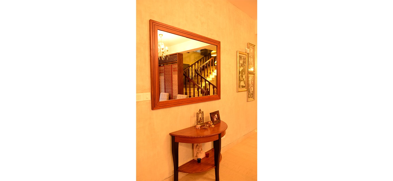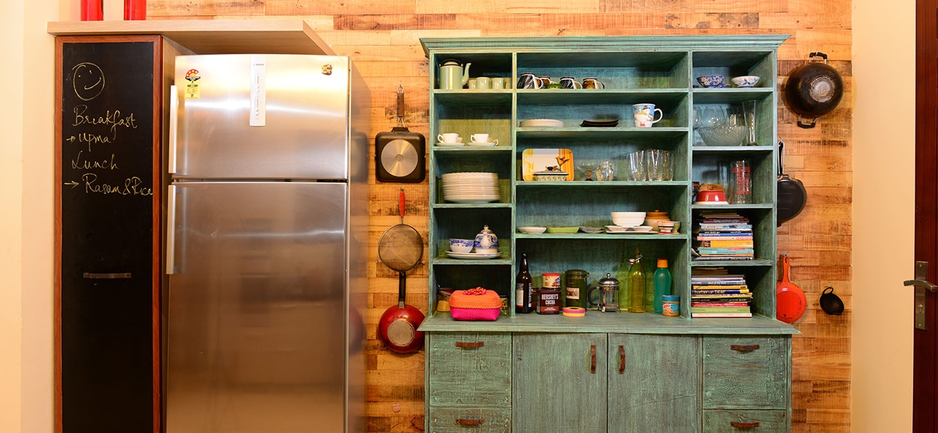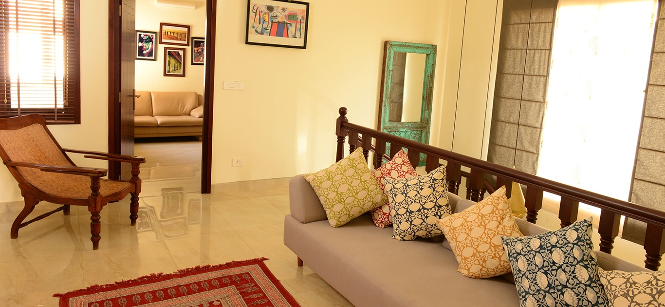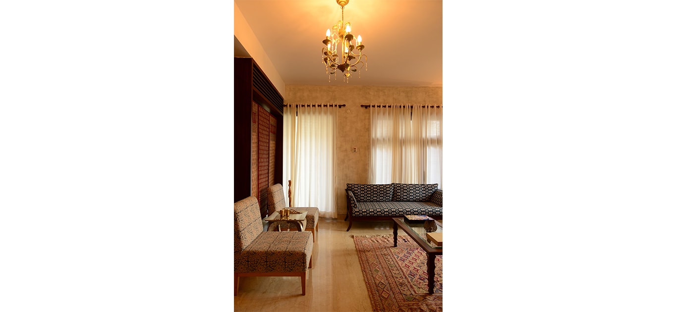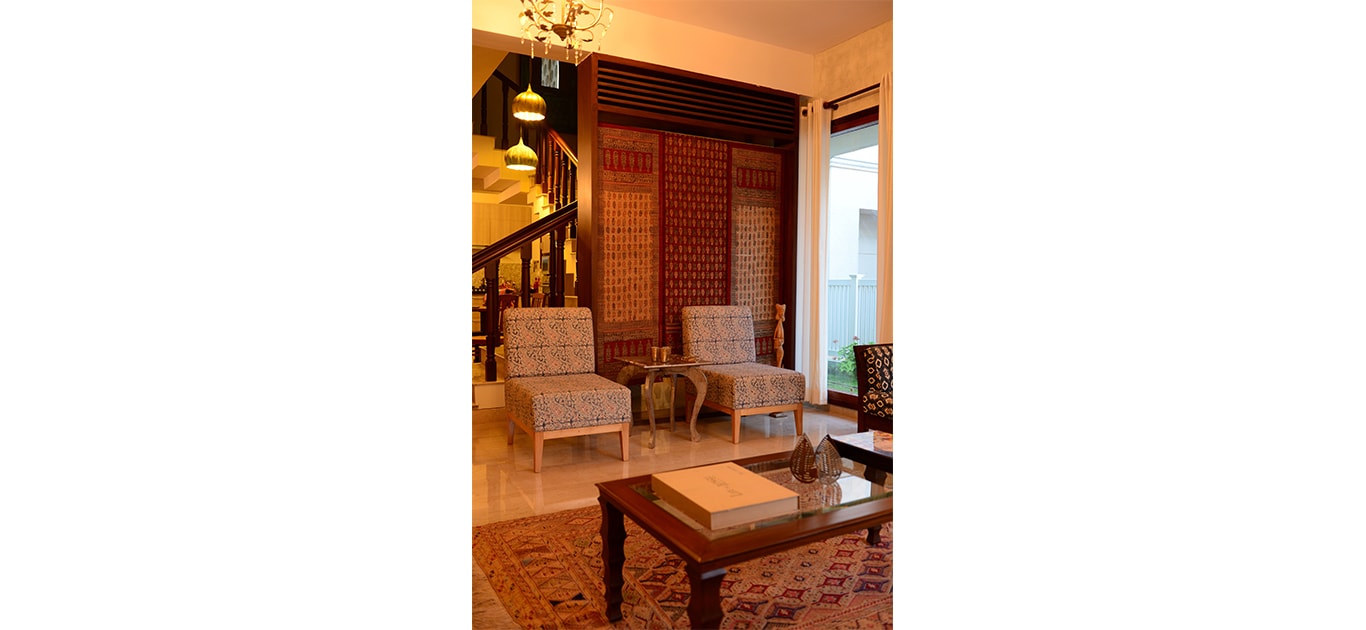 We designed the villa keeping the passion for Indian arts and colours in mind and celebrated these through our design. The Villa is spread over 5000 sq. ft., with a backyard garden which was converted into a kitchen garden partly. The client had just returned from a textile trail through North India and had an interesting hand block printed collected with organic dyes fabrics, drapes, rugs and blinds. We designed the Villa around her passion for India, her colours, and celebrated the same. The walls were finished in exposed concrete textured paint with distressed furniture and simple line pieces. Copper lights and the tree of life dotted her staircase and double height stairwell. The kitchen wall was clad in pinewood and accentuated by a sea green distressed crockery cabinet that was built at site.