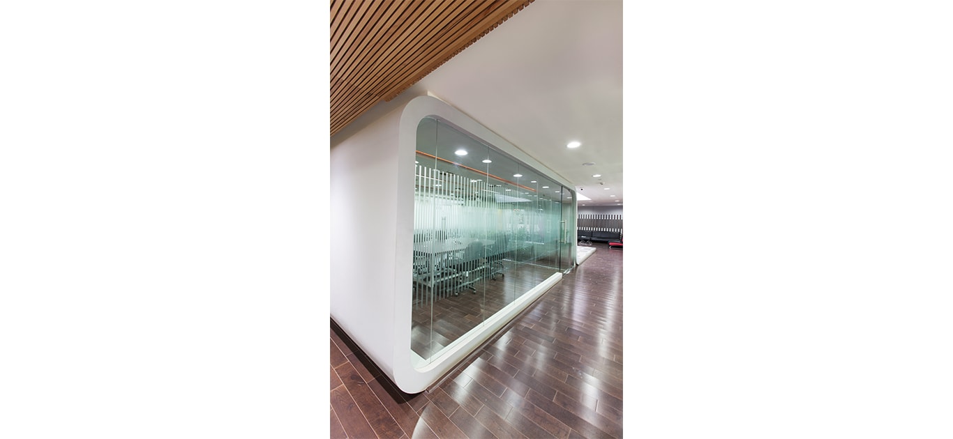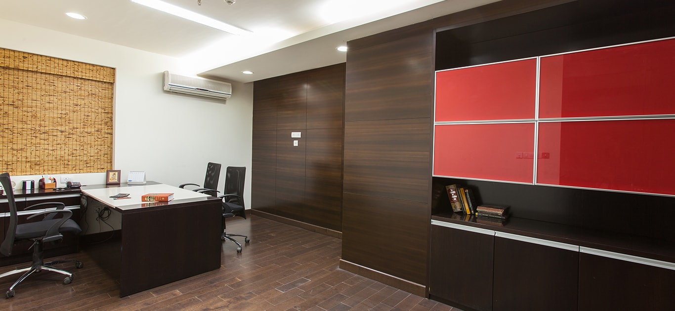 Spread over 12,000 sq. ft. on a single level, the challenge was the width of the building as it is extremely narrow. To get the feeling of expanse in, we punctured the reception area outwards by extending the roof into the sky and creating a glass box. Thus Volume and light became abundant. The tone of wood used in the main areas is light and the colours used where grey, caramel and dark brown. The ceiling was kept as the main element of focus.