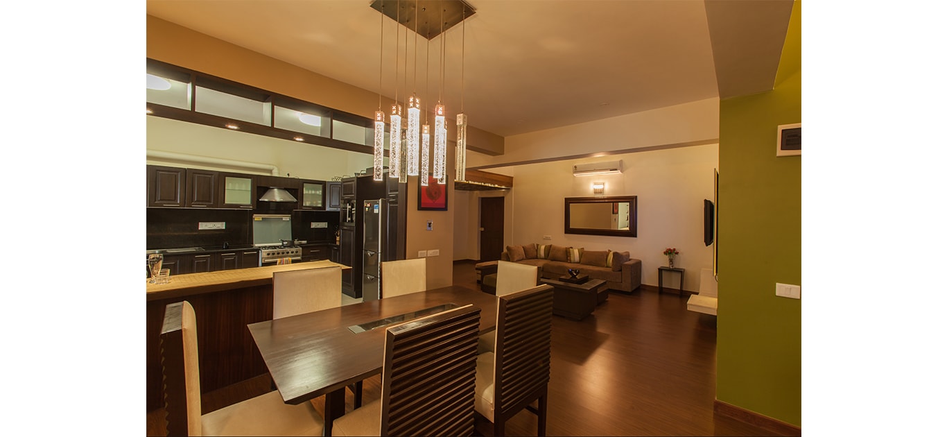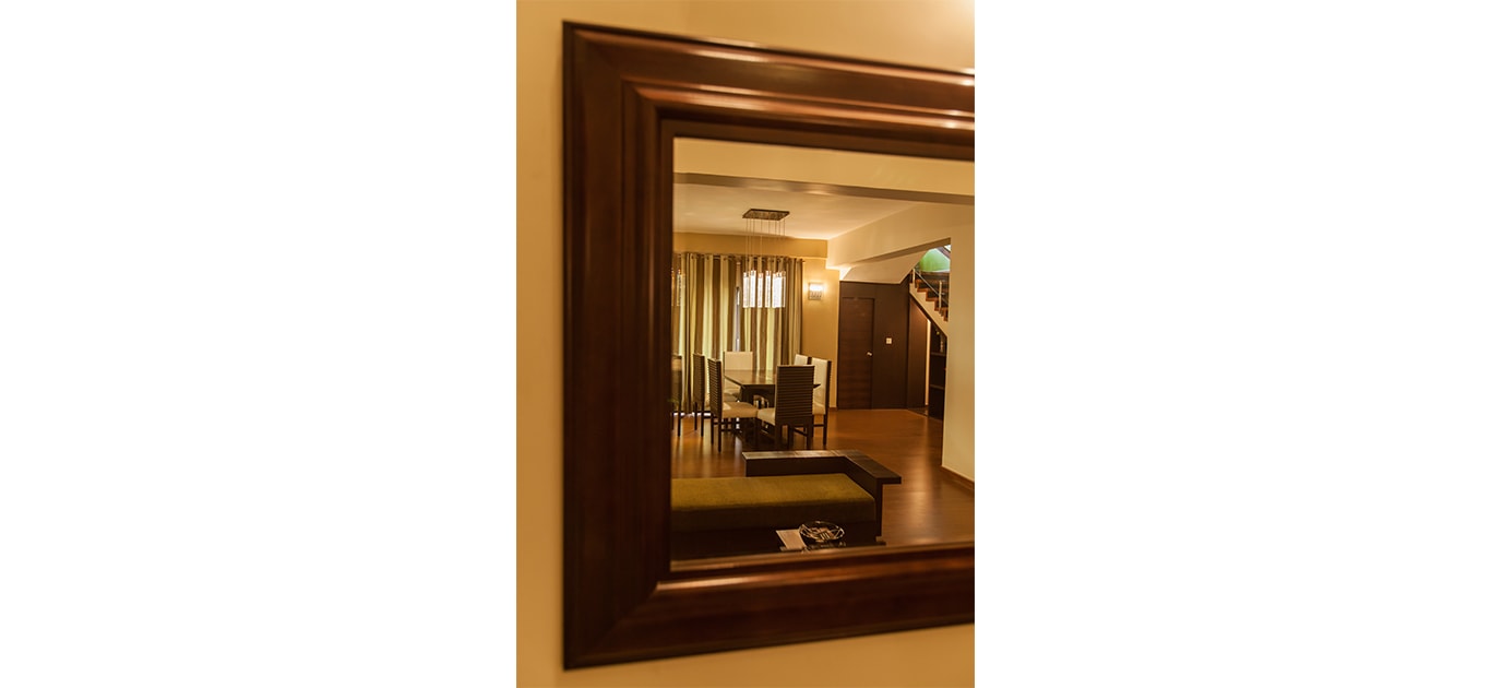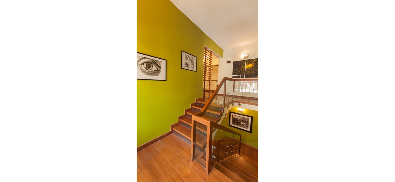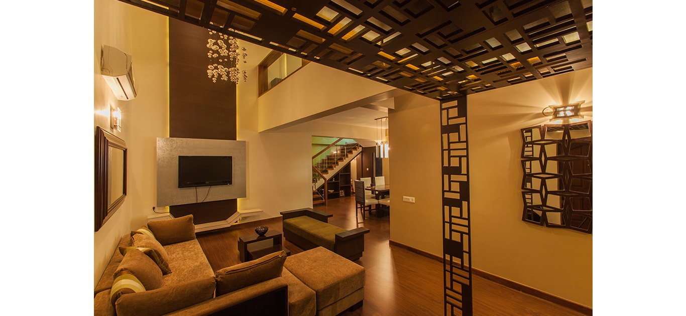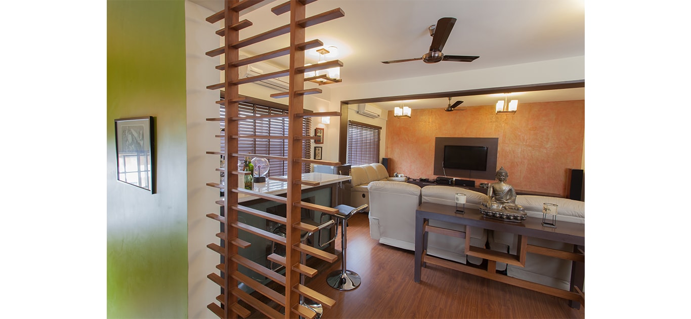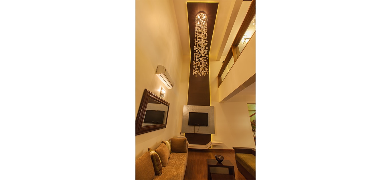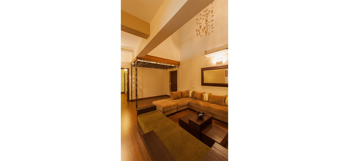 Shardu’s apartment is a classical Bachelor Pad however with a quirky take which is in tune with his personality. Having returned from the US, he had plenty of pieces of furniture and art which we used effectively. The palette was kept to browns and greens. The highlight of the penthouse was the custom made wooden staircase with glass and stainless steel railing. The fun element was added at the entrance foyer, a back lit screen cave that you enter through.
