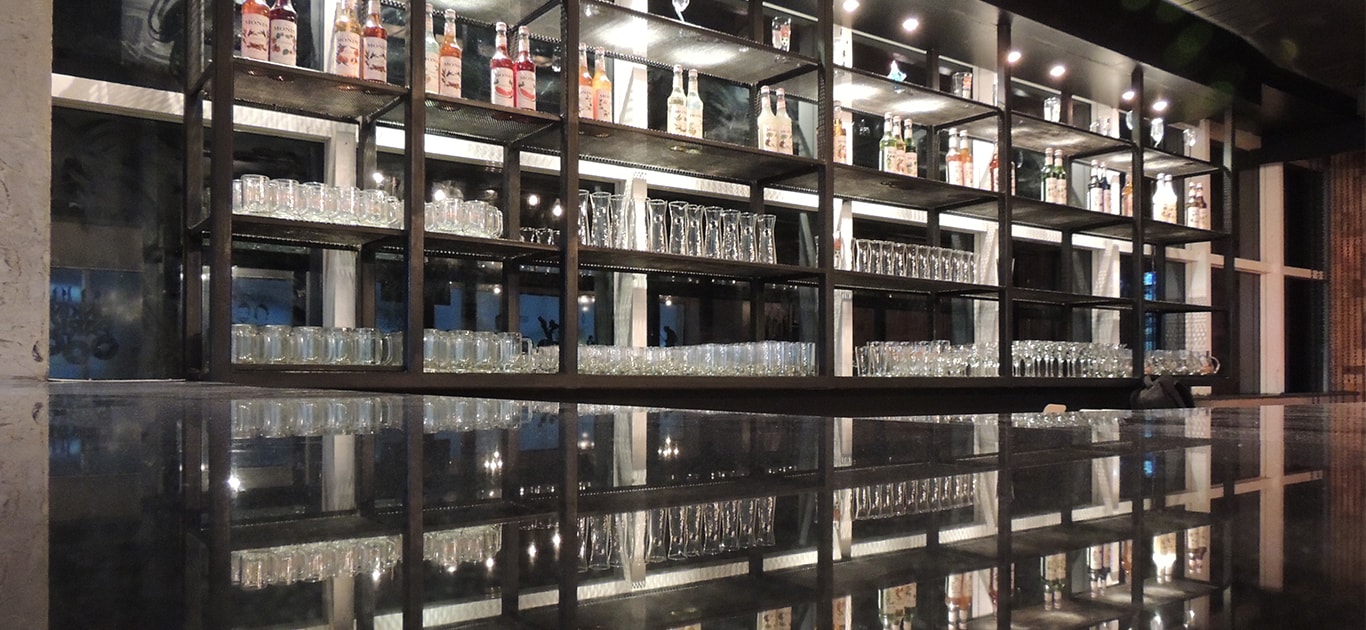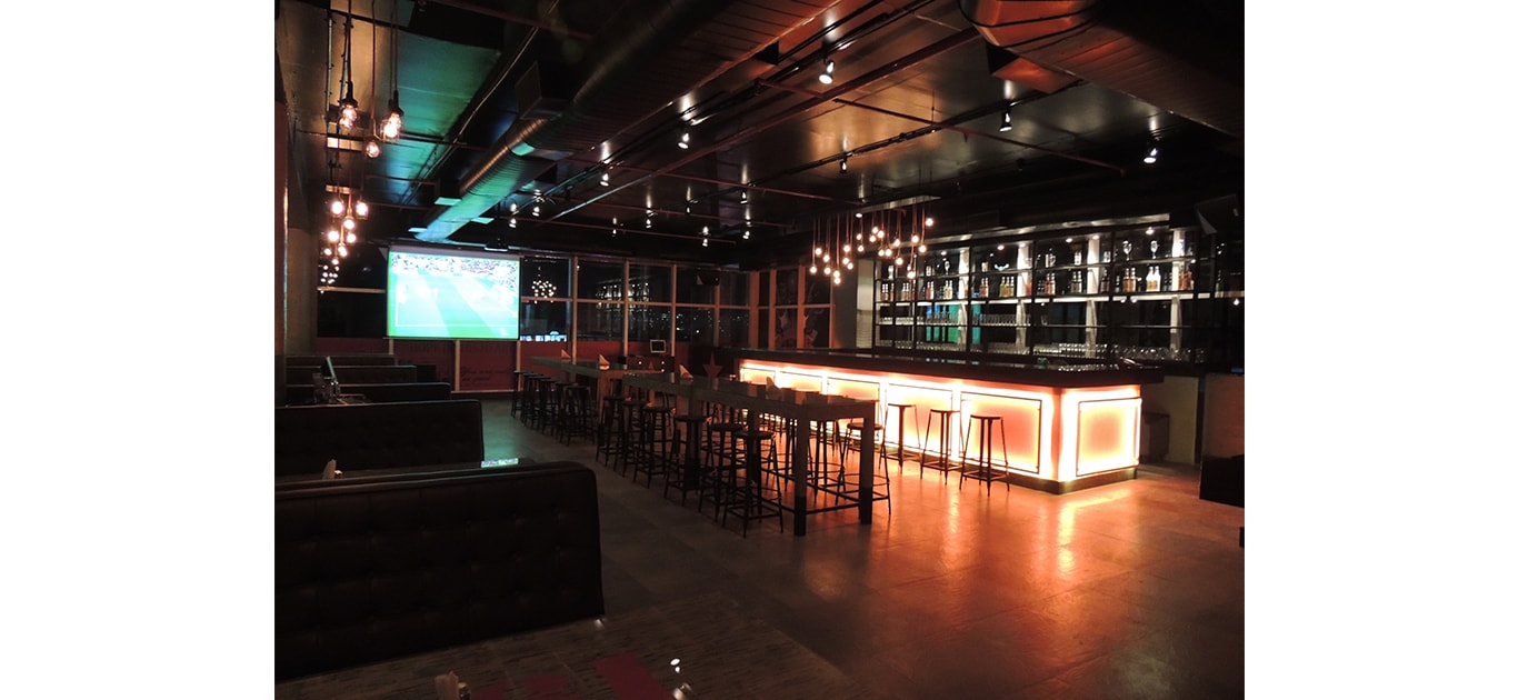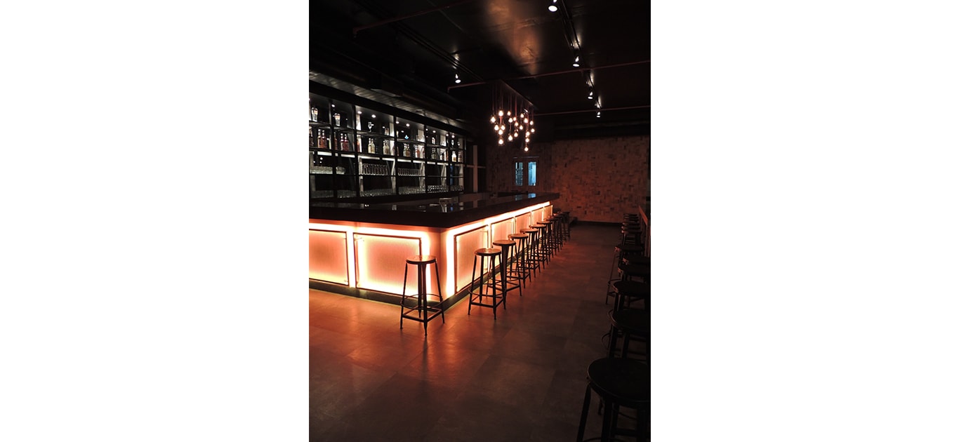 The concept of the design was industrial with a predominant SoHo vibe to it. We used grey & black as the base palate and red as a highlighter colour. Use of grungy elements like MS chains, rusted keys, distressed furniture, and stickerings on the glass. Pinewood was used throughout the space interspersed with MS. There is a decidedly ‘funk’ feel that the space achieved. The pièce de résistance is the bar that was made at the site. All the furniture was custom made and designed by CDS.
