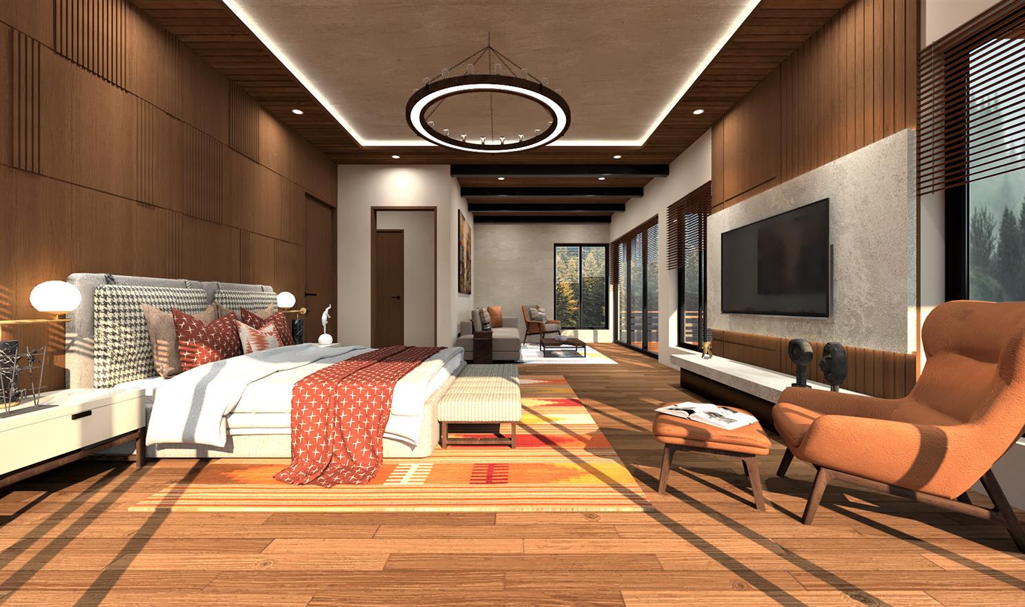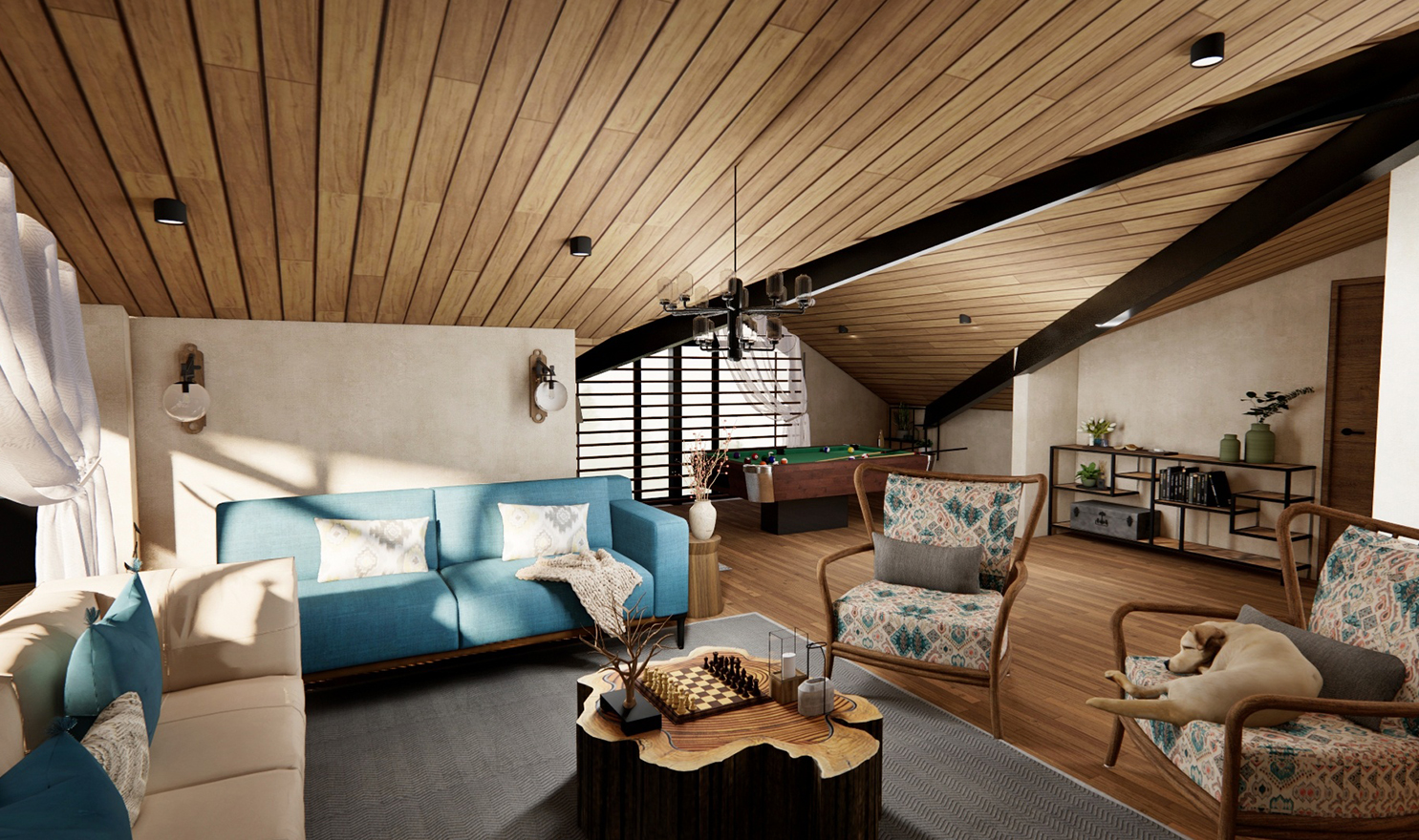 Located on the uppermost floor, The attic recreation features a cozy seating area and snooker table for recreation. The neutral colour palette with a dash of colours and patterns give the space a special charm and warmth. While the proximity of the common areas to the full length glass facade overlooking the mountains elevate the biophilic spatial quality, the bedrooms were envisioned as little havens of their own.