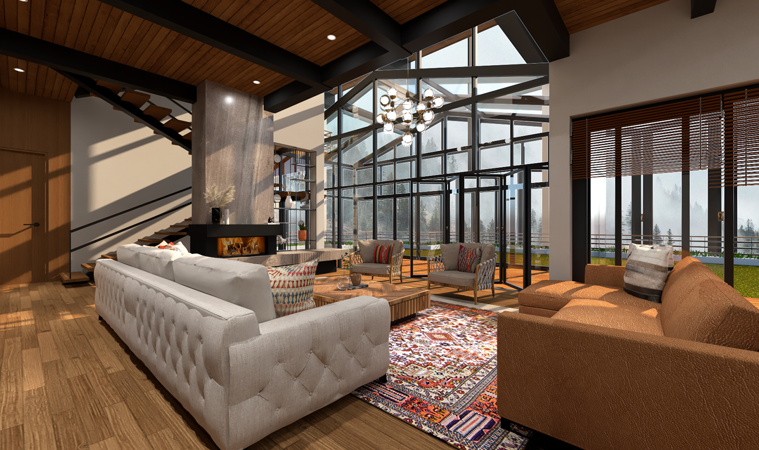 The interiors of this Mountain home has a put your feet up and sink in feel celebrating Indian Contemporary - minimal comfortable furniture, accessorised with Aztec patterned rugs, Modern chandeliers and decor maintaining the focus on the undulating views of the mountains. The double-height space in the living area opens out into a lawn, blurring the lines between the outdoors and indoors.