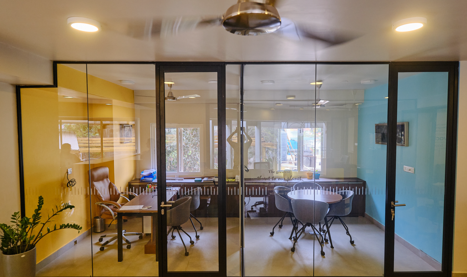 Located at one of the prime commercial locations of Bangalore, this project houses two different spaces under the same roof. Firstly a showroom for innovative construction & interior materials and an office space for a Real Estate company. The client brief was to showcase all of their products and services at their maximum potential.