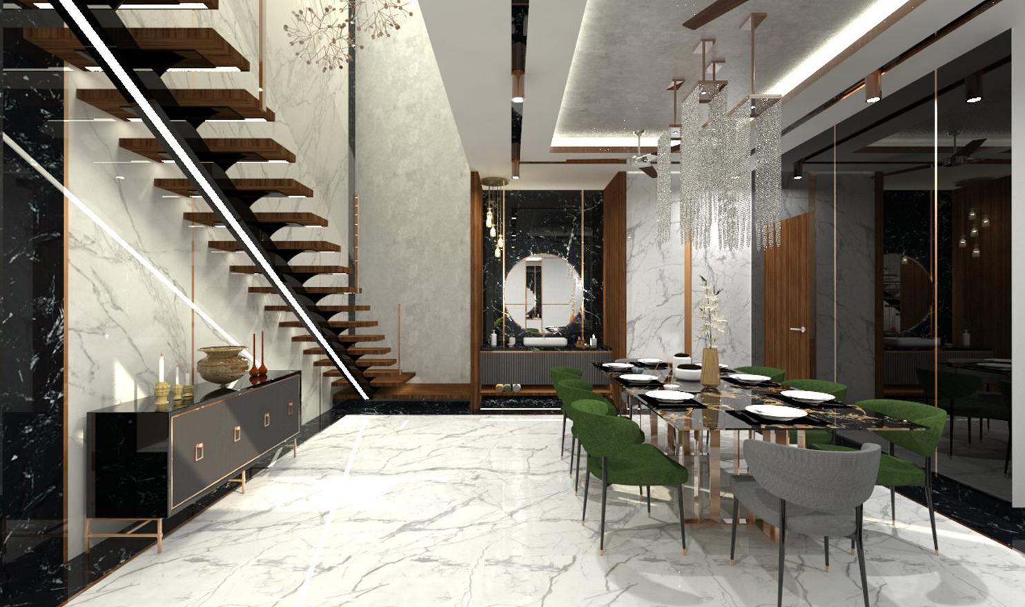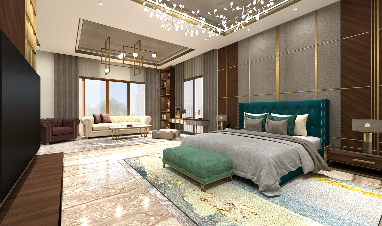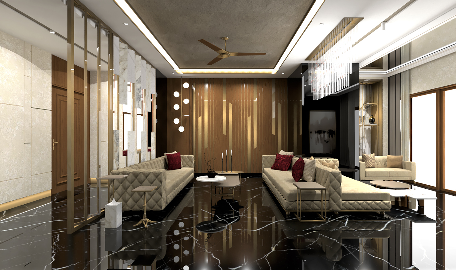 Every room was designed with a unique theme depending on each individual's choice and consequently its furniture was custom designed. Use of gold and brass elements throughout the house binds it together to recreate that aura of glamour.
